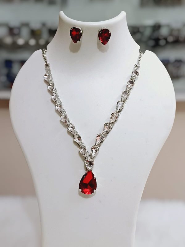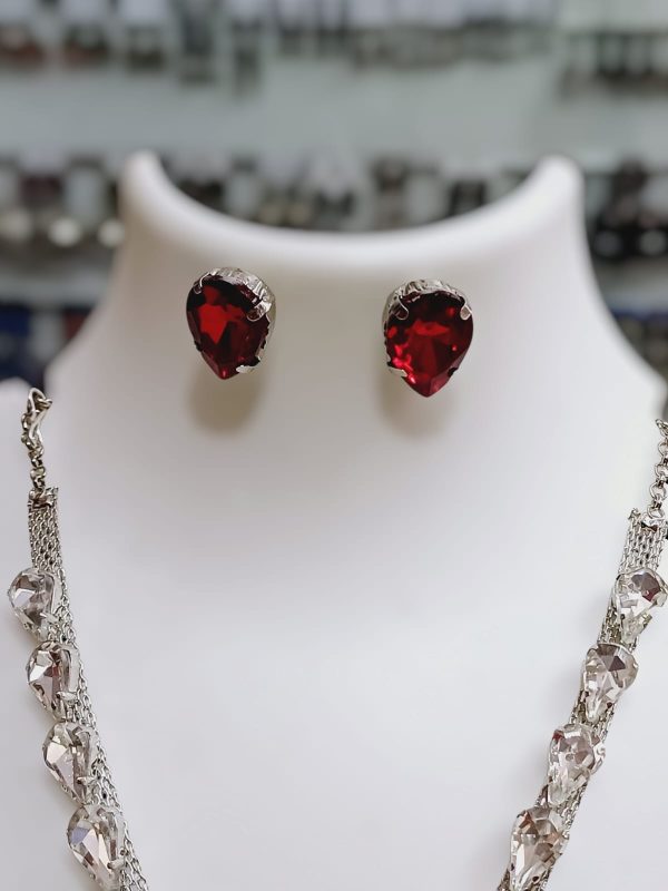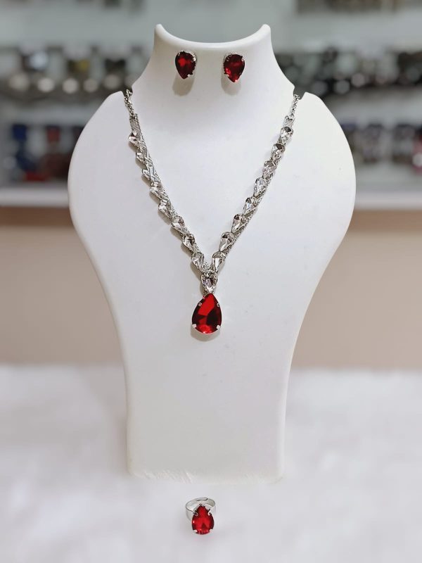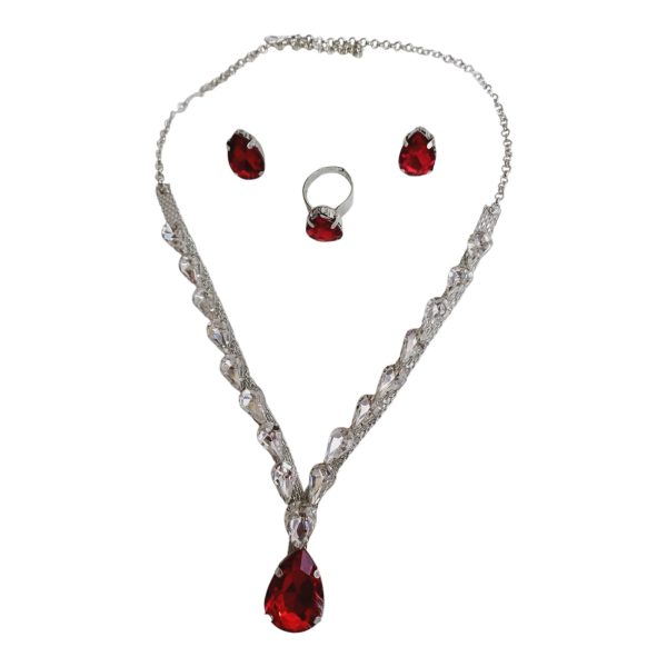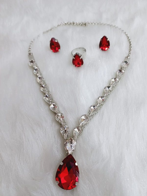 ✨ Korean RED glass stone necklace with stud earrings & adjustable finger ring ✨