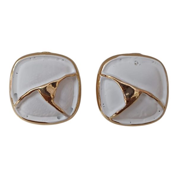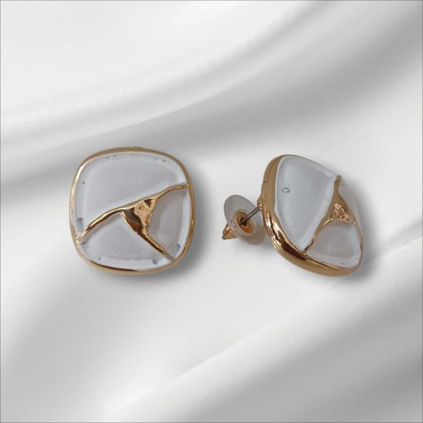 ✨ Korean Handcrafted Ceramic Abstract Square Design White and Gold Colored Stud Earrings for Girls & Women ✨
