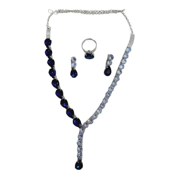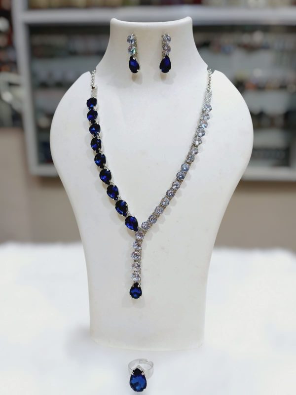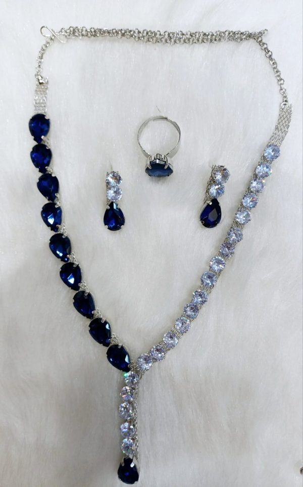 ✨ Korean BLUE glass stone drop line necklace with earrings & adjustable finger ring ✨