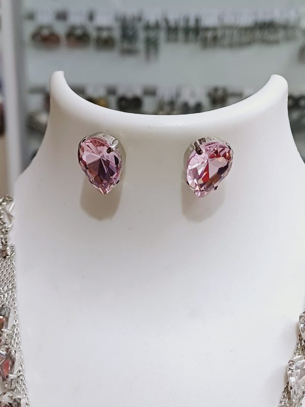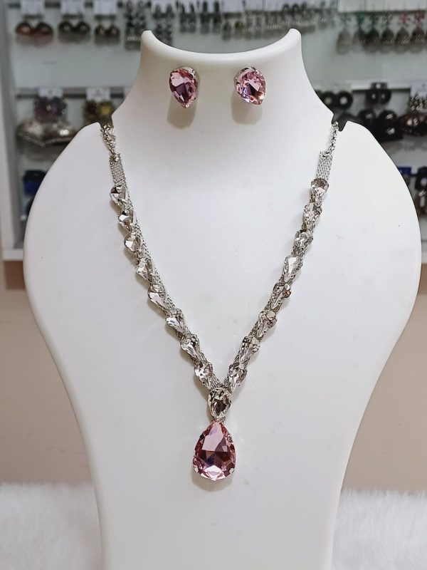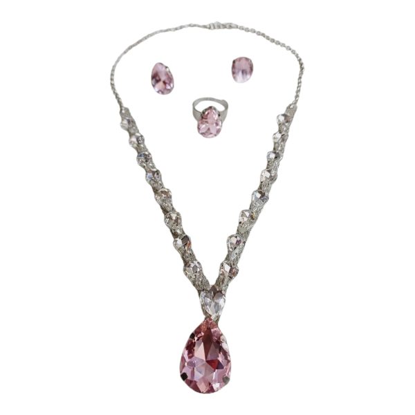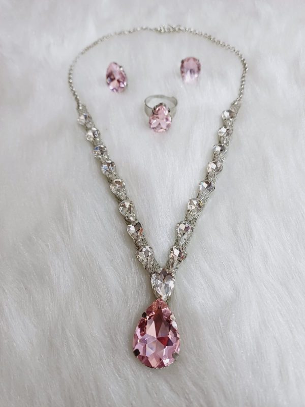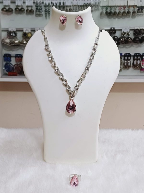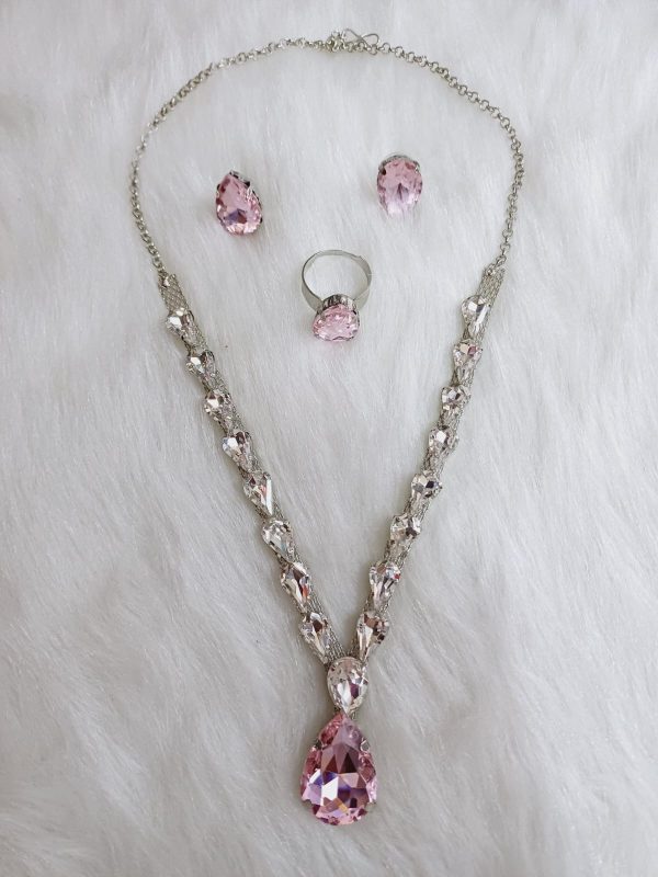 ✨ Korean Pink glass stone necklace with stud earrings & adjustable finger ring ✨