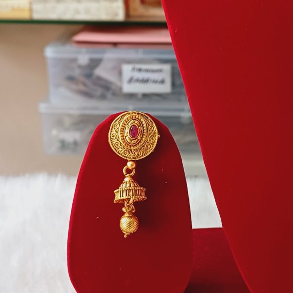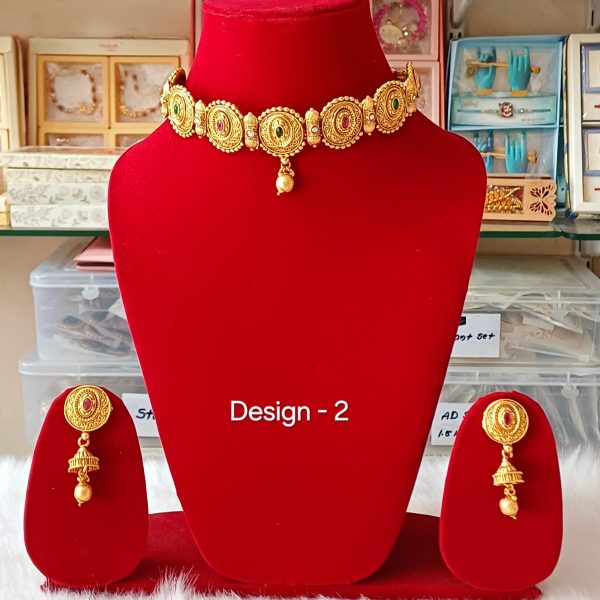 Enhance your elegance with one gram gold polish matte finish choker set, inspired by traditional rajasthani designs. Featuring intricate craftsmanship, a rich high gold finish, and matching hanging earrings. This set is perfect for weddings, festivals and special occasions. It pairs beautifully with lehengas, sarees and other ethnic outfits, making you stand out with timeless grace and sophistication. This set is designed to resemble real gold jewellery and offers a luxurious yet lightweight feel, making it ideal for both everyday wear and special occasions.